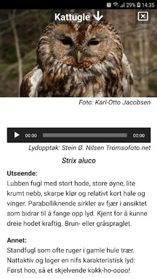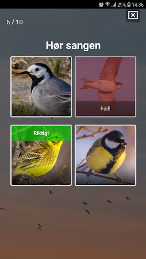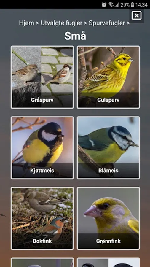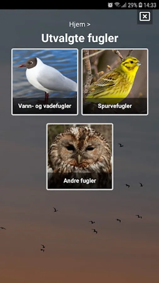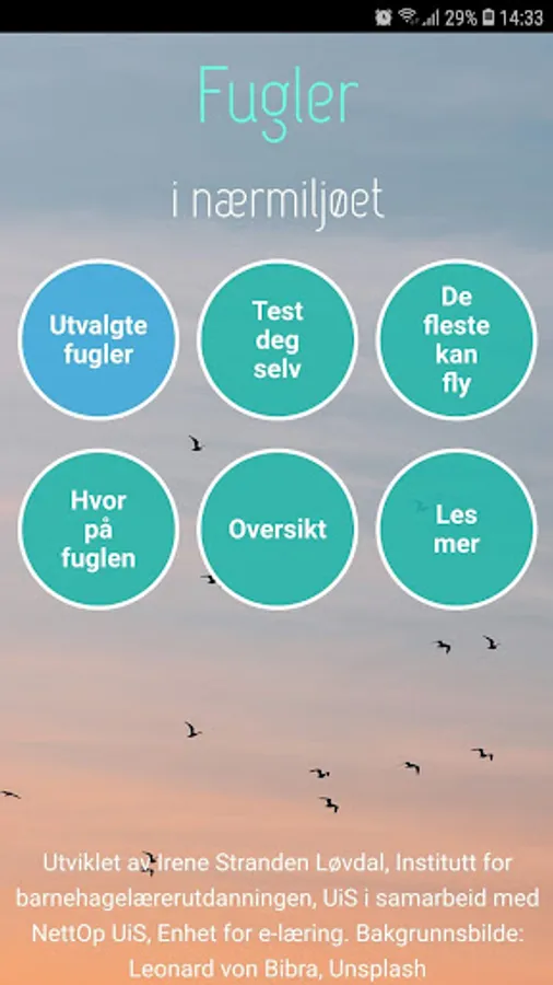 The app "Birds in the local environment" is designed for students affiliated with the kindergarten teacher education at the University of Stavanger, but can also be useful for others who want to learn more about birds. The app deals with a selection of the most common birds in Norwegian nature. The bird's appearance is described and displayed with a picture and an example of the bird's sound is included. The purpose is to make the user better able to recognize some of the most common birds we have in Norway. The app also contains two quizzes to test and train your own art knowledge. Furthermore, the app contains two charts. "Most can fly" deals with characteristic adaptations of birds' anatomy and physiology that make them fit to fly. "Where on the bird" deals with naming the various parts of the bird. Background literature is listed under "Read more".