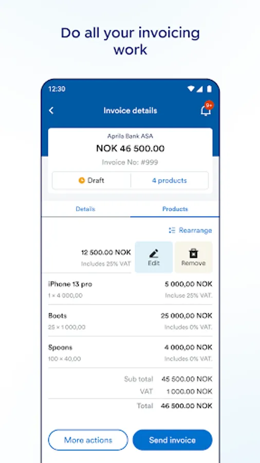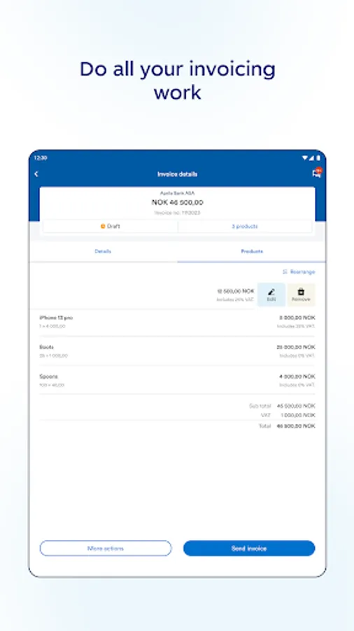 Create offers, orders and invoices. Prepare an invoice and handle it later, or send it directly to a customer.