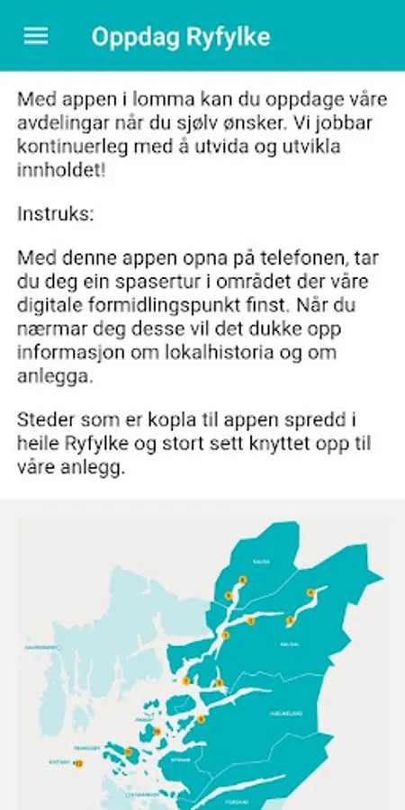 Through this application you get to know more about our sites in Ryfylke. Activate this application when you visit our sites. Here we tell you what you did not know before, and what you do not find at our signs. This application will give you access to new information brought to you in a new way.