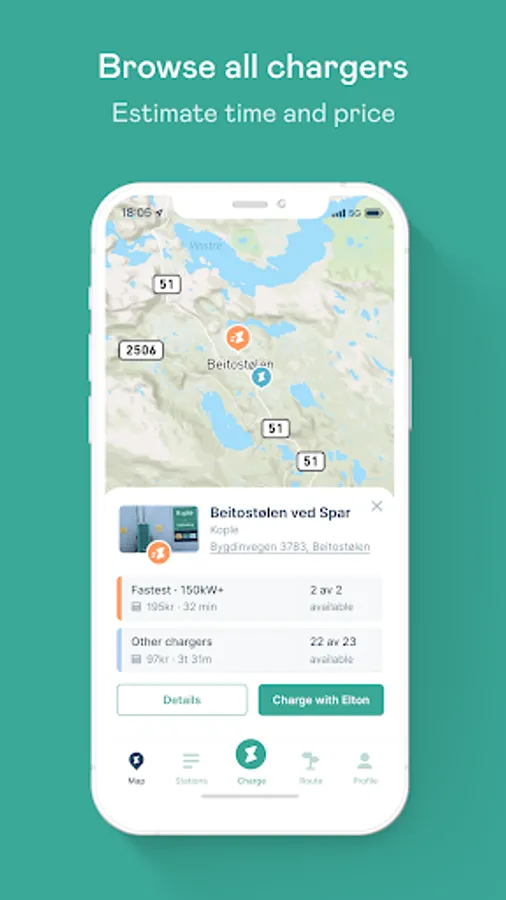 - Charging station map: easy overview over matching chargers, estimates, availability and location information