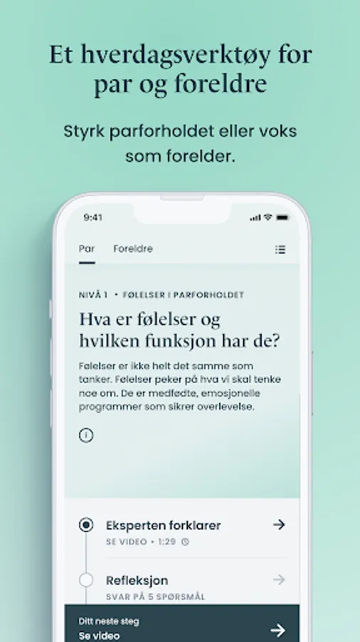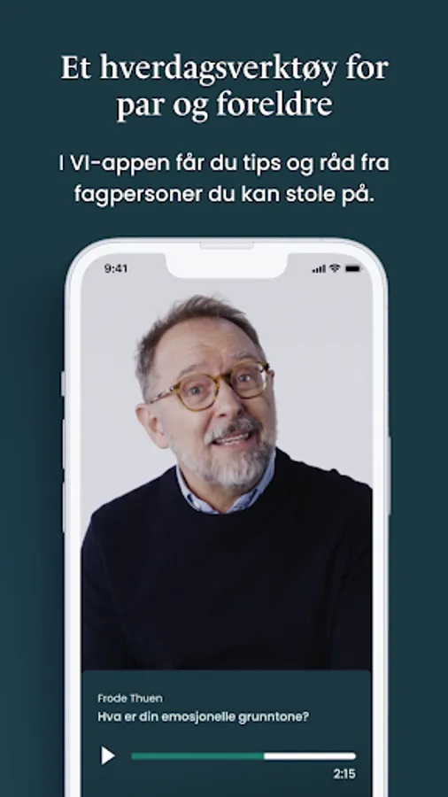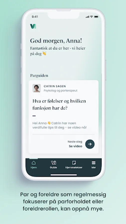 The VI app is an everyday tool for all couples and parents. Here you get help to strengthen the couple's relationship and to grow as a parent. The VI app has been developed by some of Norway's foremost professionals in the field of cohabitation and parenting, including Catrin Sagen and Frode Thuen. The Directorate for Children, Youth and Families has supported the development.