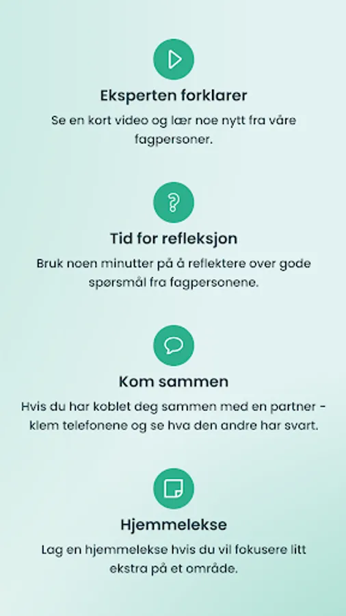 In the VI app, you get professional advice, reminders and help to talk about important topics - built on research-based knowledge. You can choose to work with the couple guide, the parent guide or both.