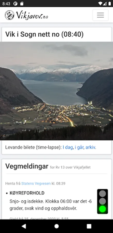 Weather and road information from Vik in Sogn. With the Vikjavev app, you get notifications when Rv 13 over Vikjafjellet closes, opens or there is column driving.
