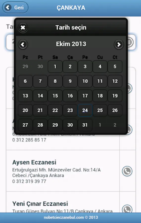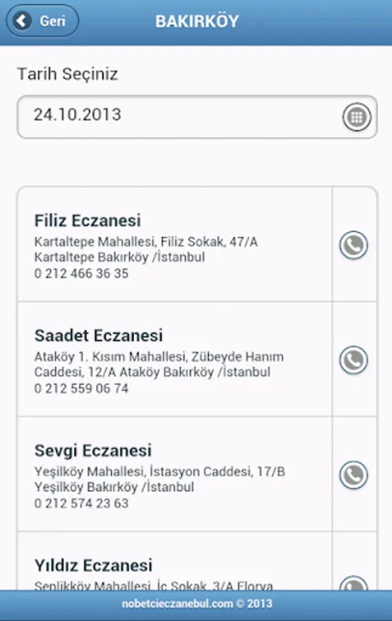 * Produced by http://www.nobetcieczanebul.co and offered free use of this practice pharmacy data, Pharmacy rooms, Turkish Pharmacists' Association and is the data published by provincial health directorates, the lack of data or mistake does not accept any responsibility originated.