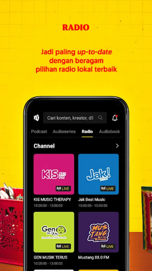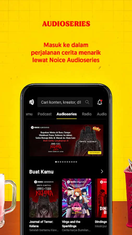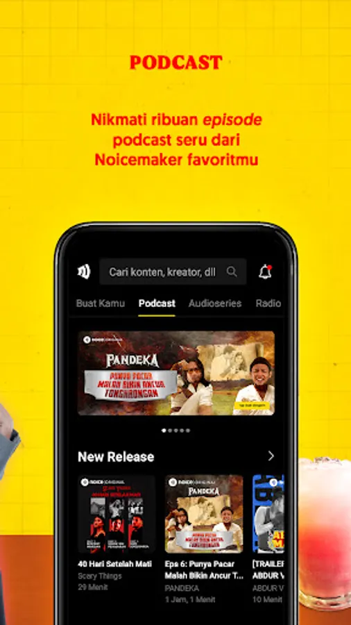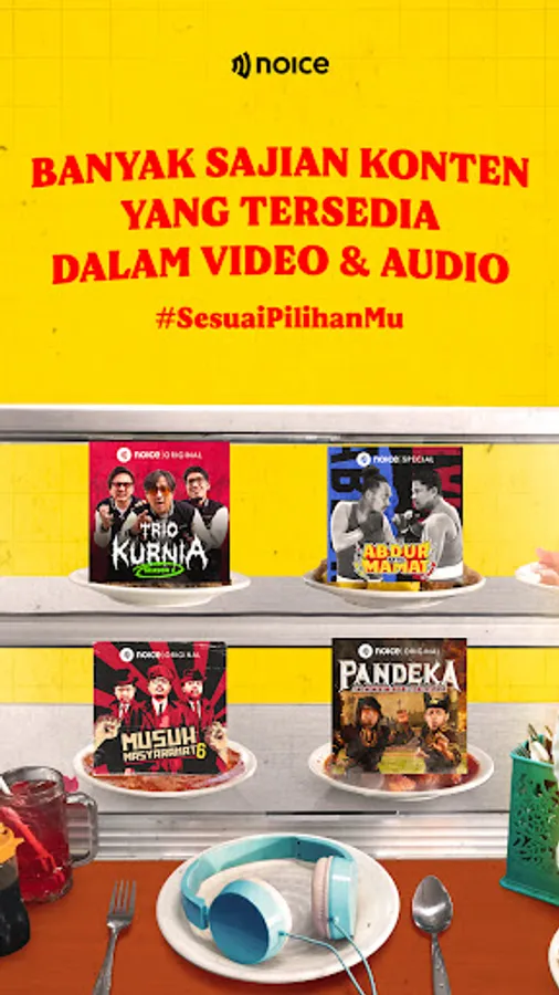 Let's listen to Noice! The most complete local audio content application to accompany all your activities. Starting from listening to podcasts, radio, audiobooks, Noice live, which is ready to make your day full of fun accompanied by your favorite creators: Vincent Rompies, Desta, Andre Taulany, Deddy Corbuzier, Coki Pardede, Tretan Muslim, to Raffi Ahmad!