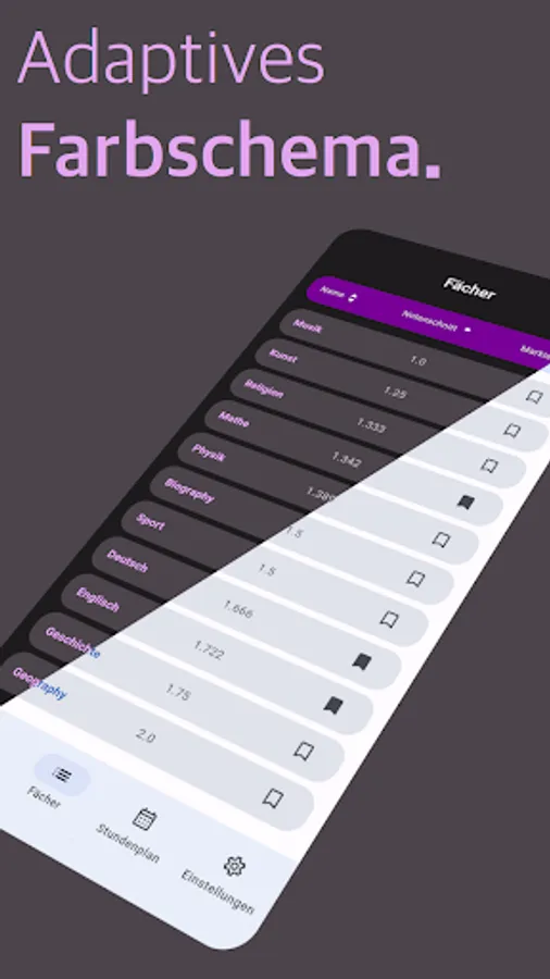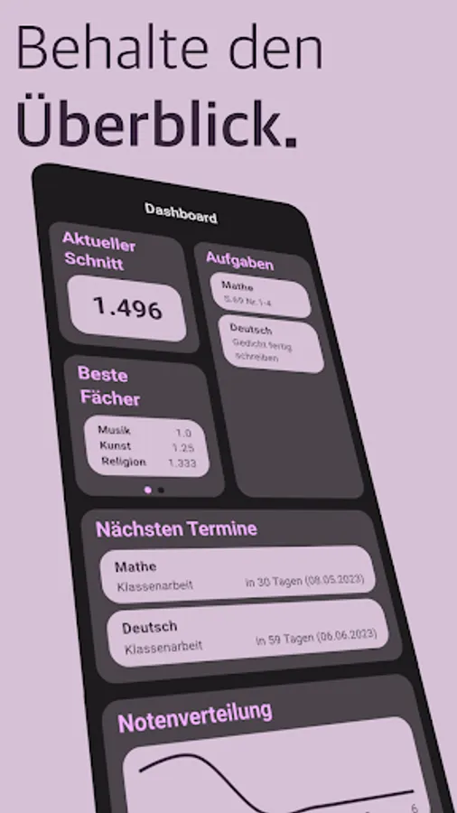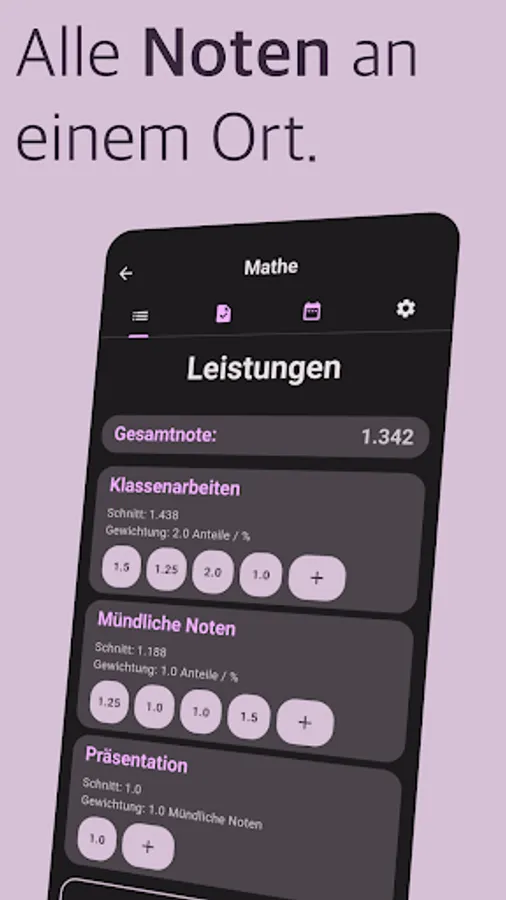 Your grades are the central topic in school. With the help of the app you always have an overview of where you are. You can enter any type of performance test and weight it like the teacher does.