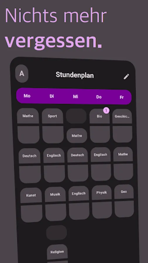You need your timetable every day, so we have kept it as simple as possible so that you can see at a glance what is coming up next. Also included: A&B weeks, a day and week view as well as a reminder of upcoming tasks in the respective subject.