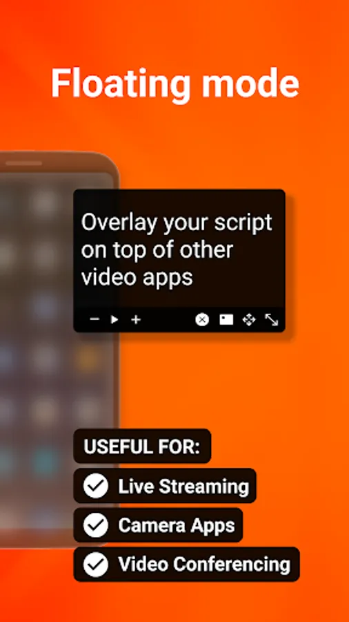 Use the floating mode to overlay your script on other video apps, allowing you to read from a script while live streaming, video conferencing, or using other specialist video apps.