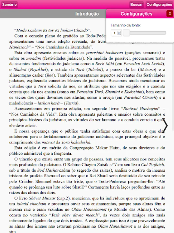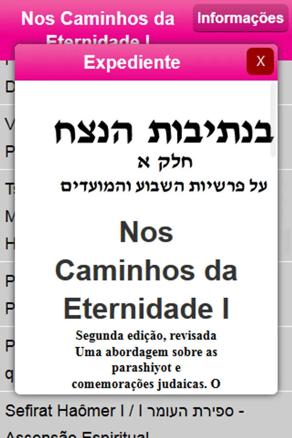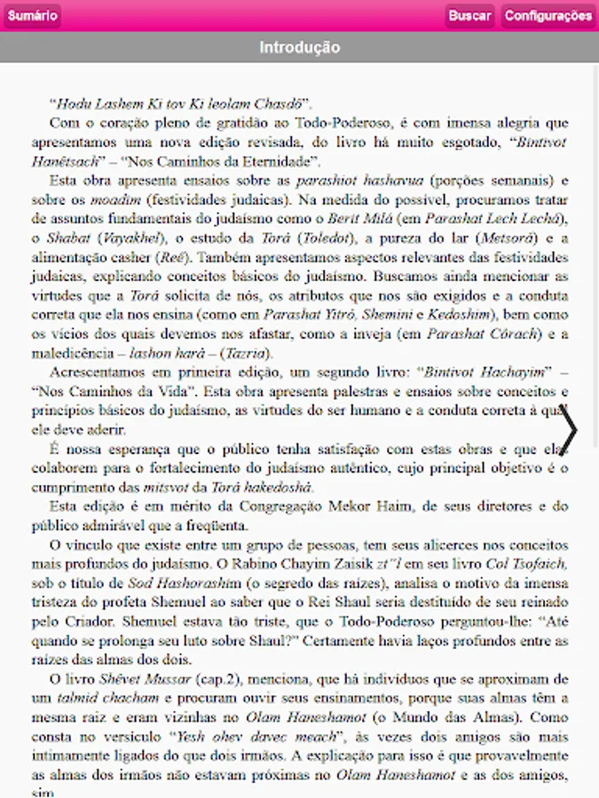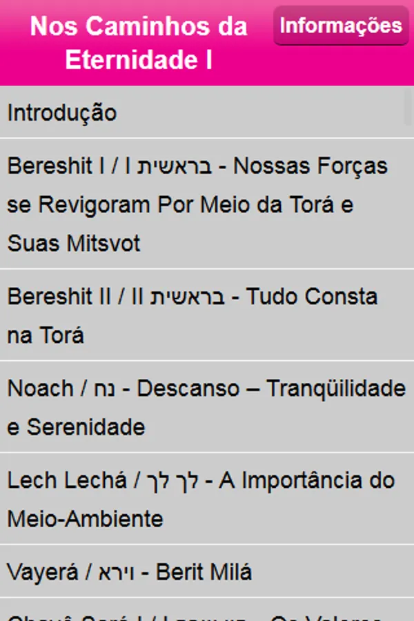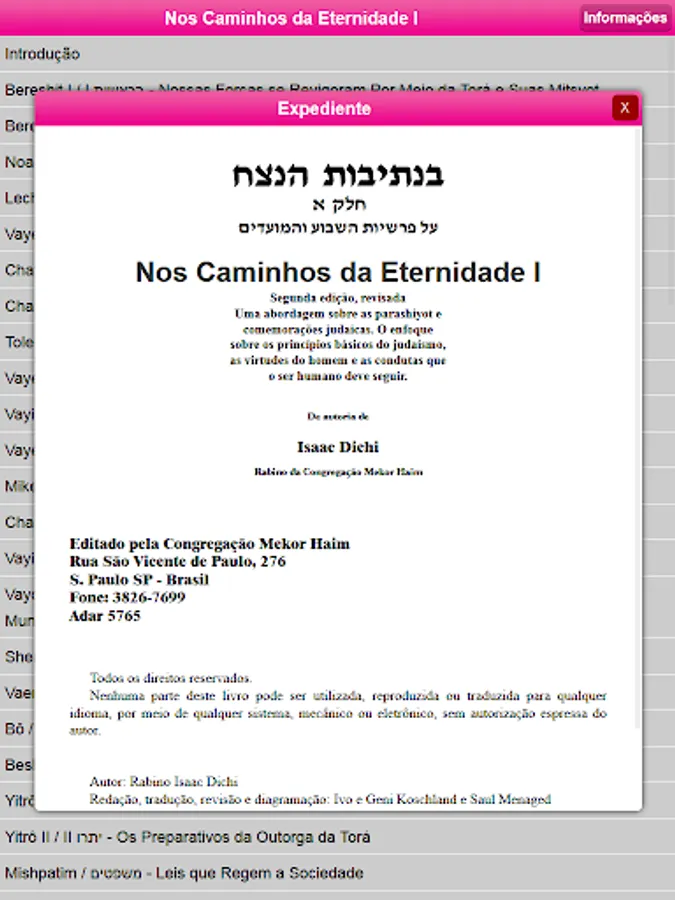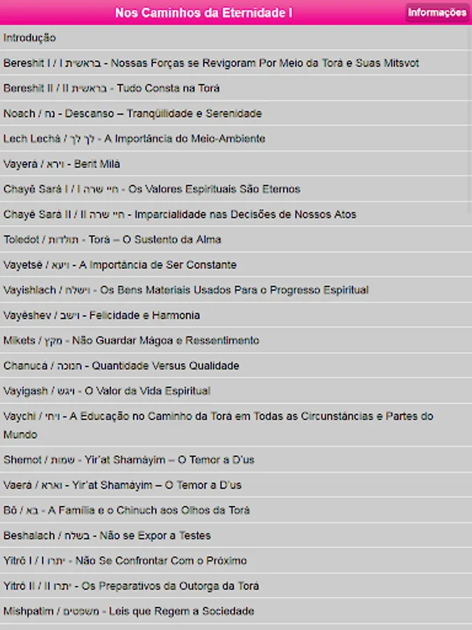 to lecture on the basics of Judaism, as the Berit Mila, the tefilot (prayers), kashrut, Shabbat, Jewish education and purity of home. It also brings the Jewish approach to the virtues of man as grace, serenity, impartiality, happiness, harmony, agility and the fear of God. In addition, it seeks to show that the behaviors that human beings should follow, such as humility and agility, and what defects of which should stay away, as pride and nervousness.