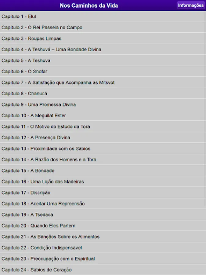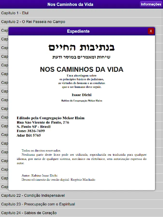 In this work, the Dichi Rabbi (Rav Dichi) of the Congregation Mekor Haim talks about fundamental concepts of Judaism, as the study of Torah, teshuvah, tzedakah - charity, blessings and responsibilities of men. It also virtues and behaviors that humans should look like the joy, satisfaction, kindness and discretion.