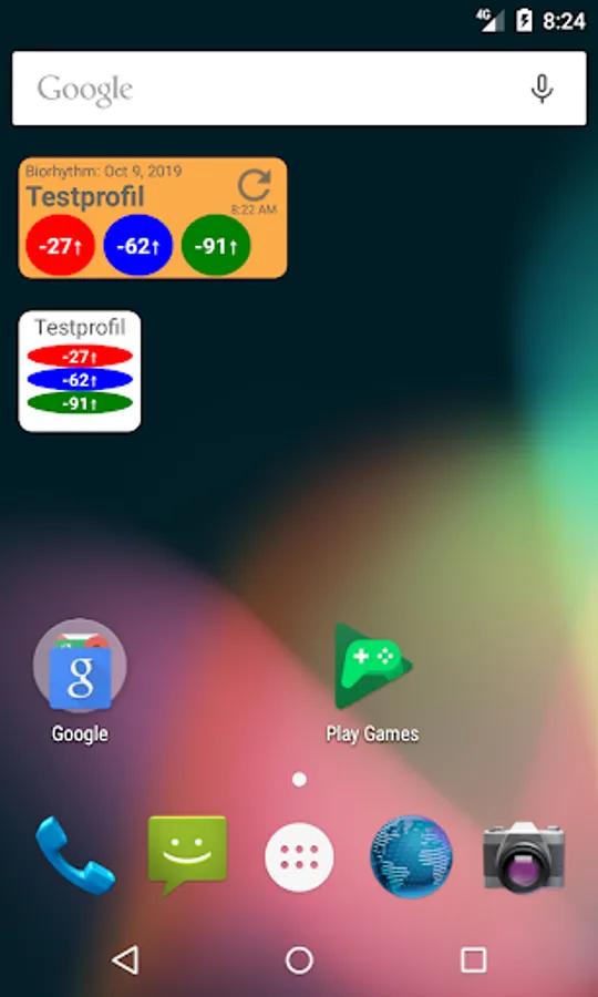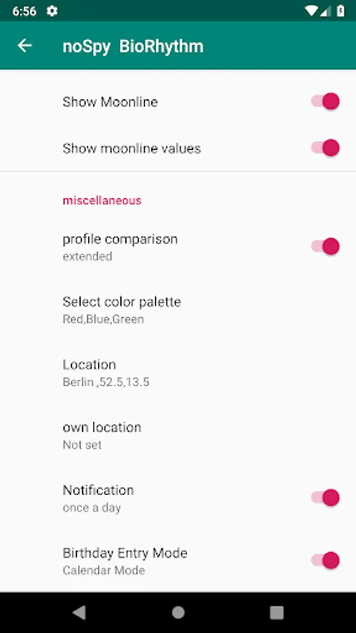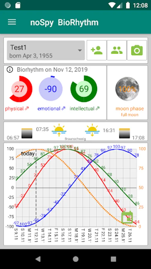 Calculation of the course of the three biorhythms physically, emotionally and intellectually as well as the phases of the moon. The calculated personal daily values are displayed in a pie chart.