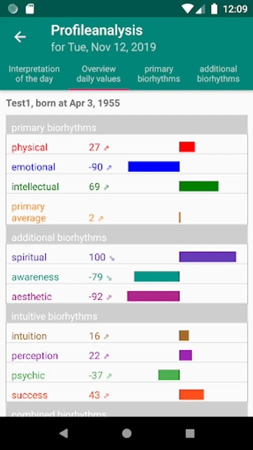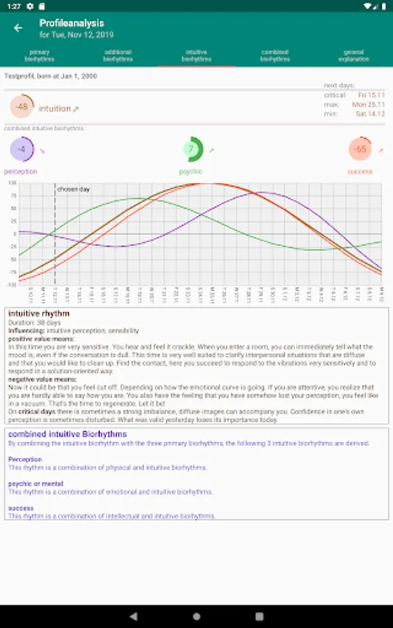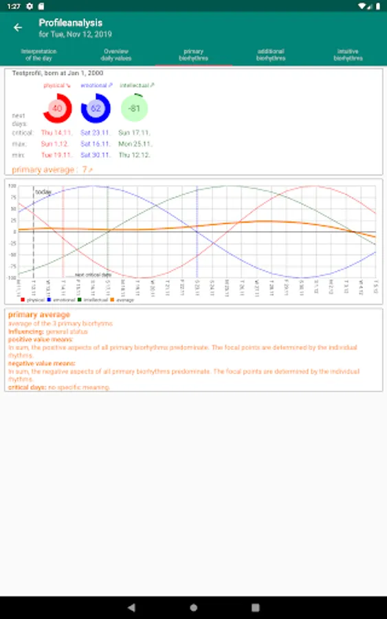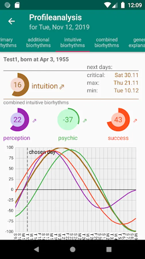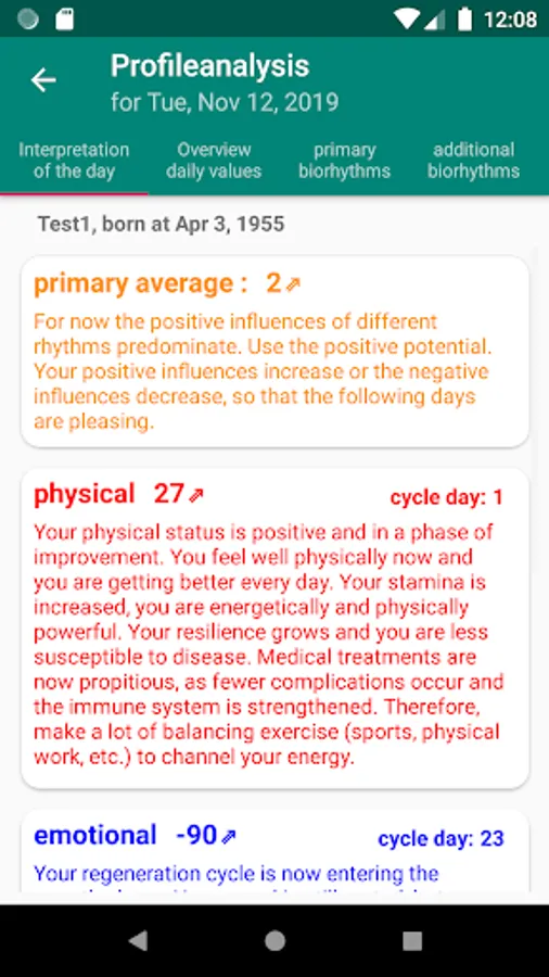 By starting the daily analysis, you will see the next critical days, the next maximum and the next minimum in addition to their daily values and the average of the primary biorhythms incl. linechart. Here are the next critical days graphically highlighted. Further explanations will help you to interpret the daily values. Furthermore, the daily values of the primary biorhythms are interpreted. In addition all known biorhythms are calculated and their course is displayed.