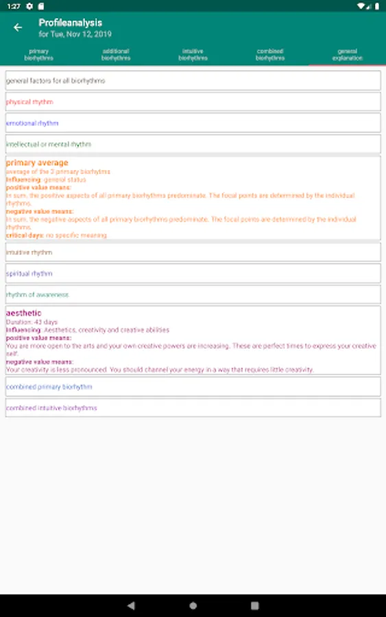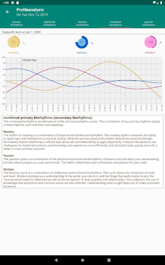 In addition, the time history of the biorhythms of the previous 30 days and the future 270 days is displayed in a line chart. The line graphic can be scrolled right and left and also zoomed horizontally (2 finger gesture). By clicking on a day in the graph, the corresponding daily values are calculated and displayed.