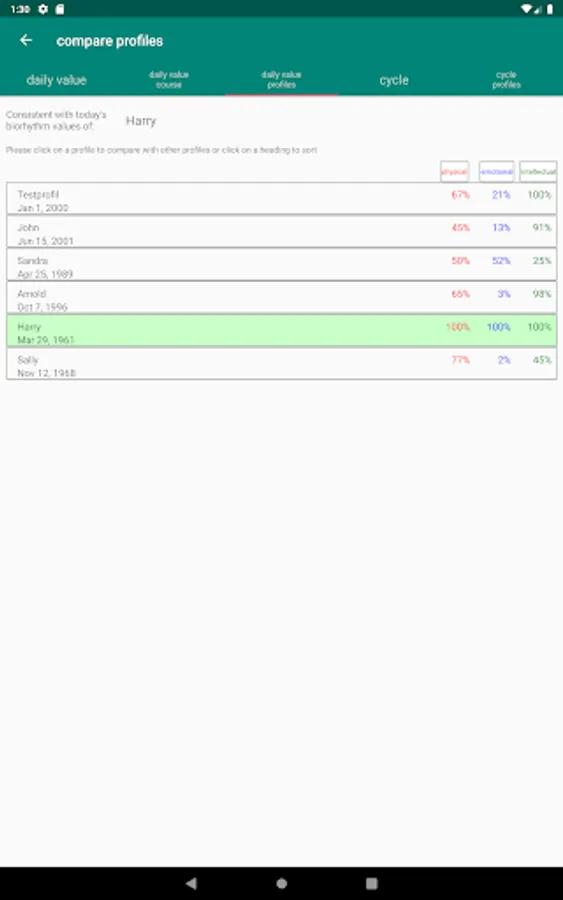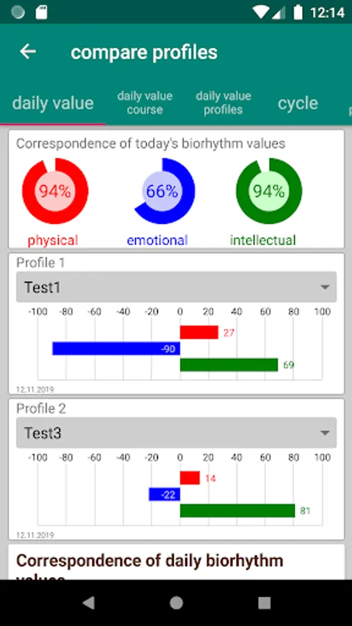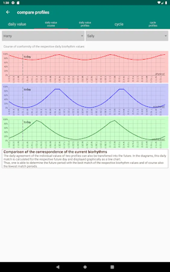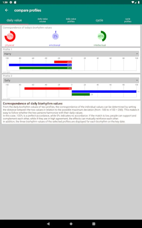 To compare your biorhythm score with friends or relatives, a comparison feature is available. Here, the app calculates the correspondence of the cycles and of the daily values between two profiles and displays the biorhythm values of the selected profiles calculated at the current date.
