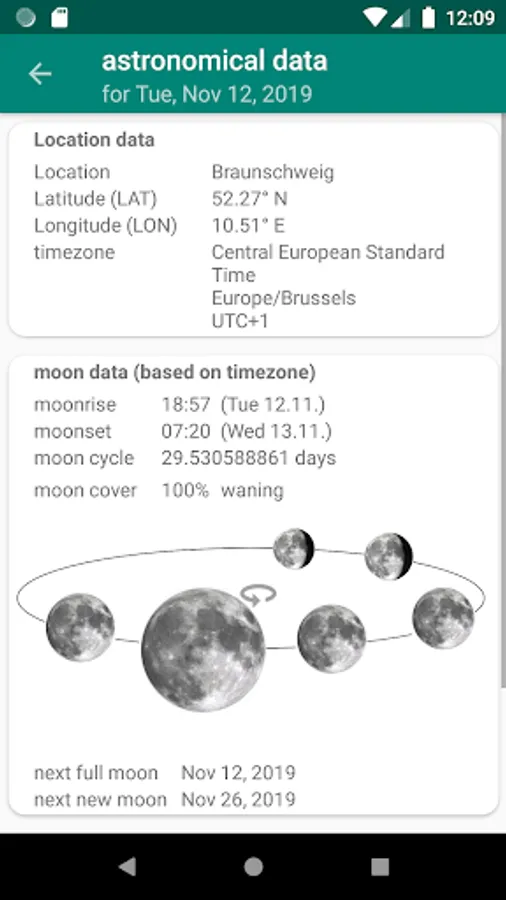 - Display of full and new moon as well as phases in pictures