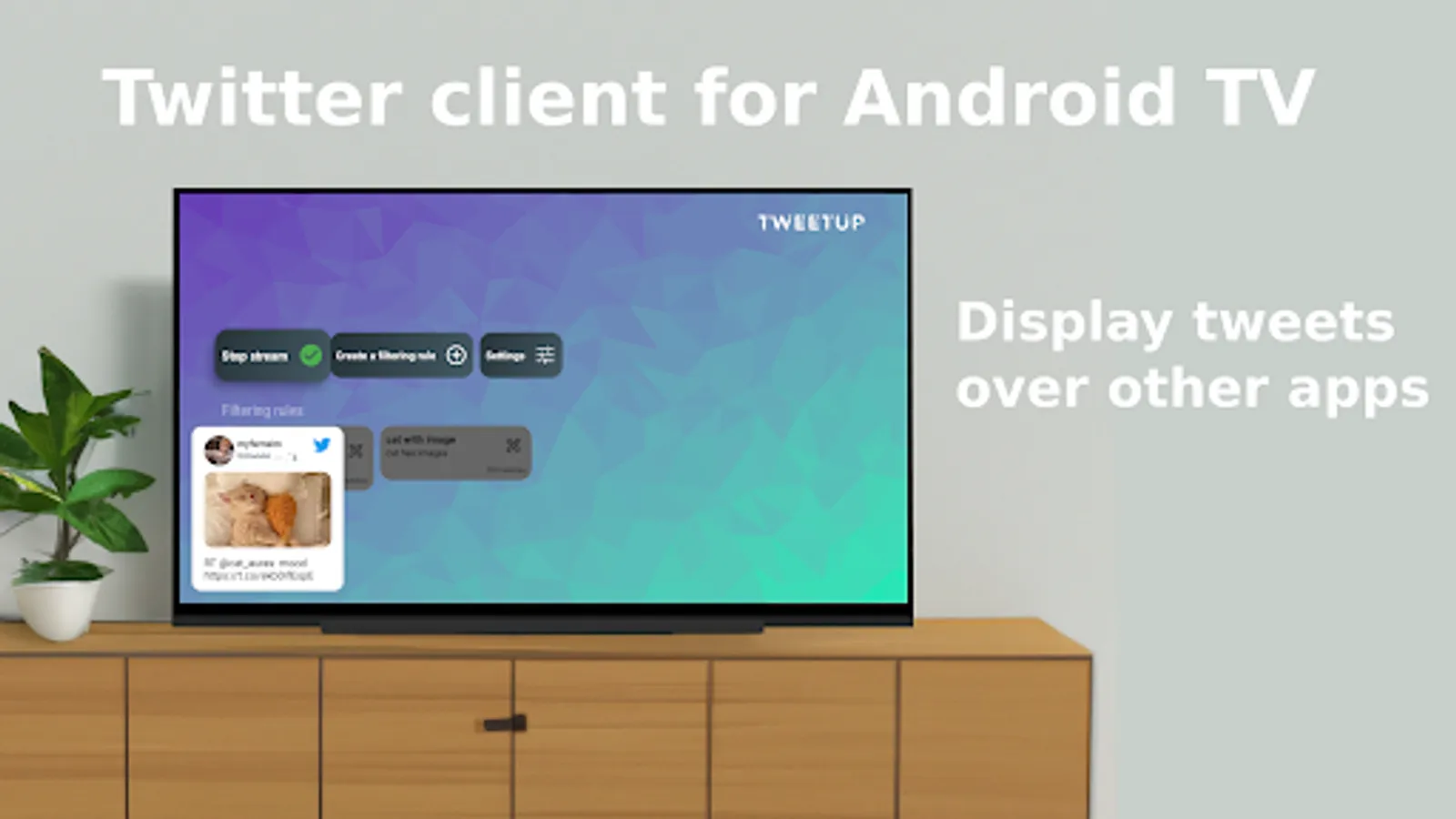 With Tweetup you can easily display tweets stream from Twitter on big screen over other apps. Just setup your filtering rules and you're good to go!