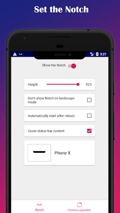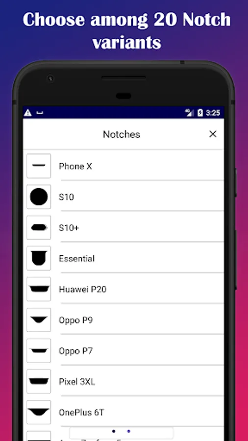 Notches app adds any of all popular top elements to any Android smartphone. This app provides a bunch of options, starting with Essential and Phone X Notches, and ending with most recent solutions like S10 and S10+ holes.