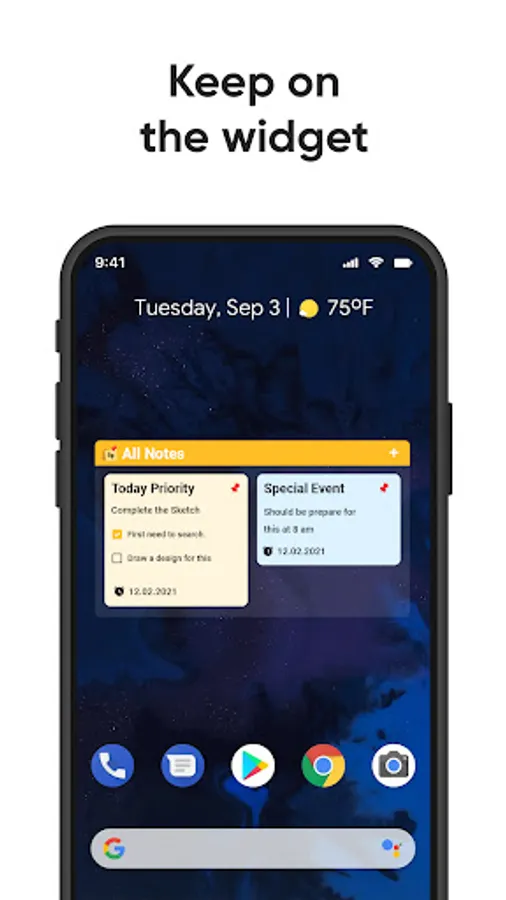 Note pad helps keeping notes of assignments, office work, or other task scenarios like an actual notebook. Note widget is not an ordinary note taking app. With sticky note you could enhance/edit all the notes from your list. You can try different font and sizes to your saved to do list and memo along with multiple color notes drawing tools, drawing re-edit option, adding checklist, task creating date. Notepad auto saved all noted tasks and lists. You can also delete noted task, memo and to do list whenever you want.