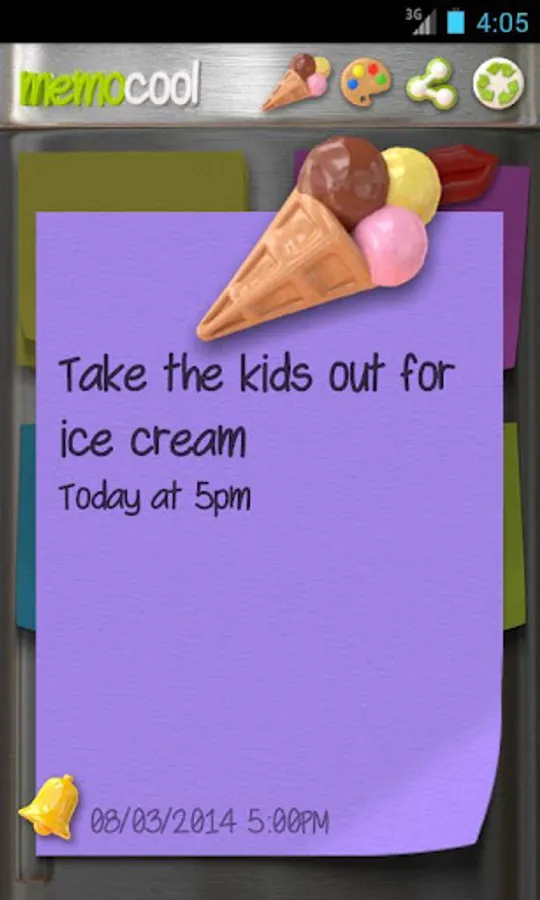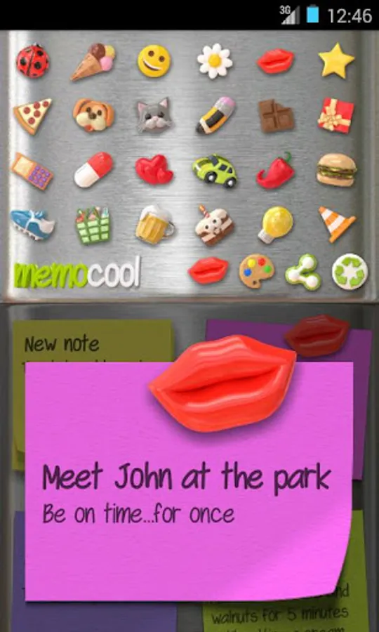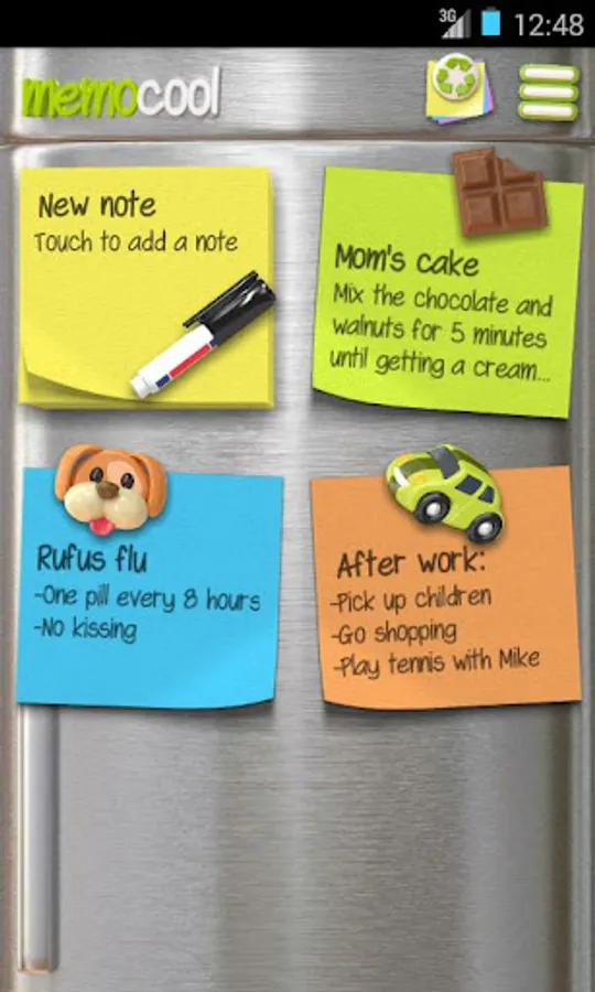 MemoCool is a simple and practical application which you can use to make rapid notes and personalise them by adding colours and entertaining magnet-like icons. MemoCool emulates the typical note stuck with magnets on the fridge in your house, but now has the advantage that you can take it with you in your pocket. You can create, edit, archive or delete notes any number of times without limit.