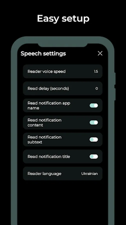 4. Customize the main settings for the notifications reader (Reader language, Reader Voice speed, Reader delay)