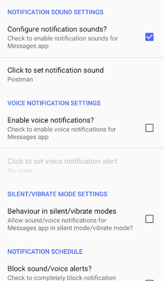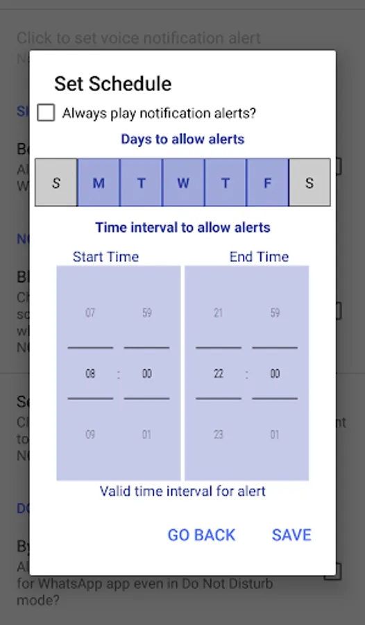 3. Set a schedule- days of week and time interval for the corresponding customized notifications to play, for any app