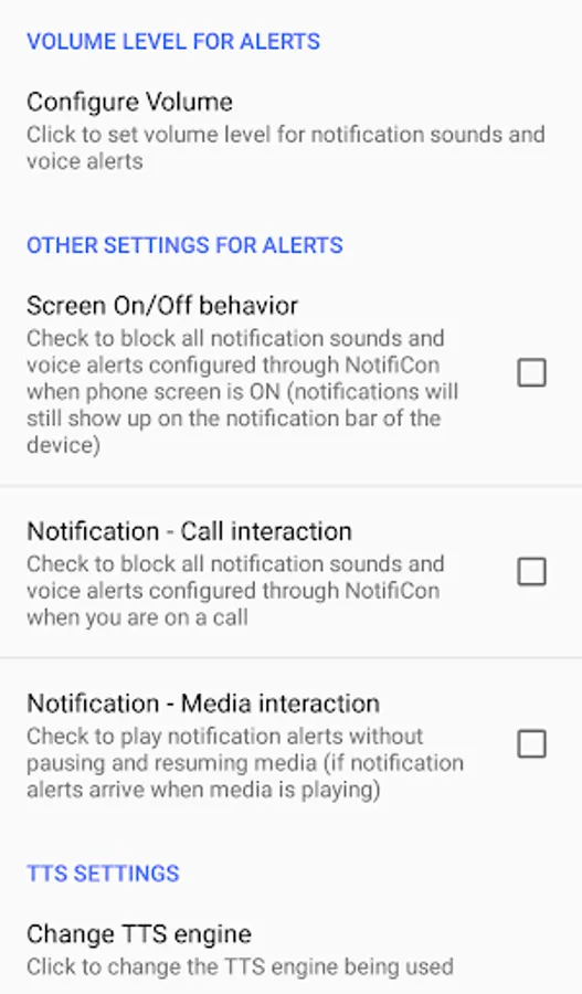 1. NotifiCon does not create new notifications, rather it provides sound/voice alerts to accompany other apps' notifications.