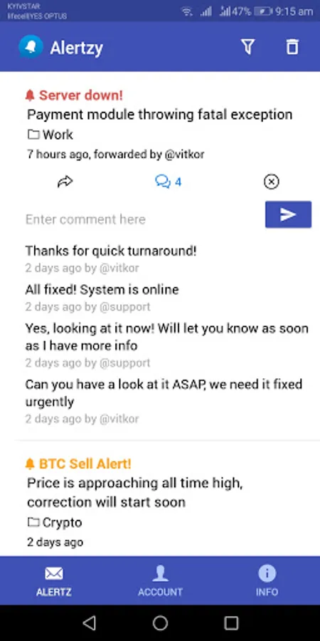 Stay on top of important alerts and take immediate action with Alertzy. Our app delivers instant notifications to your mobile device, ensuring you never miss a crucial message. Collaborate seamlessly with your team to efficiently resolve issues in real-time.
