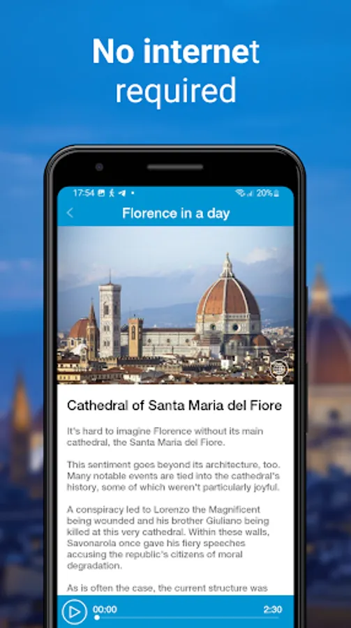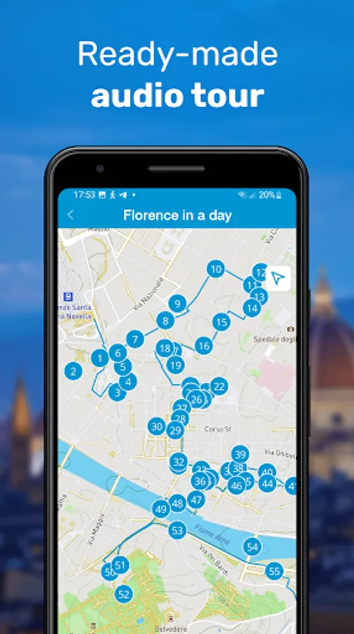 Exploring the city has never been so easy, due to the in-built Florence offline map and easy to follow, pre-planned route. All landmarks on the map are numbered in order of convenience, while GPS navigation lets you track your location and find the optimal way to the nearest point of interest.