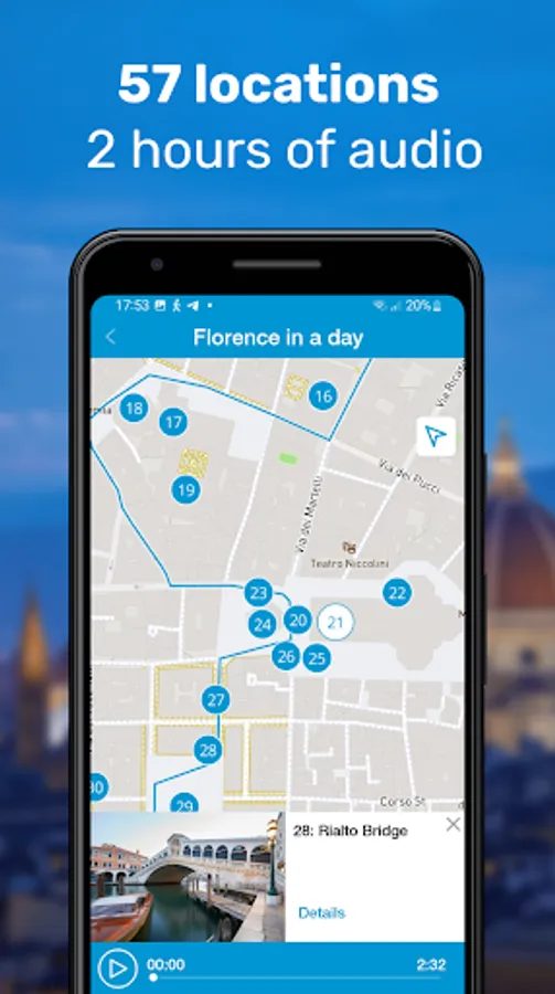 Featuring 57 exciting spots and 2 hours of in-built audio, this Florence guide will be your reliable travel assistant on your trip to Italy.