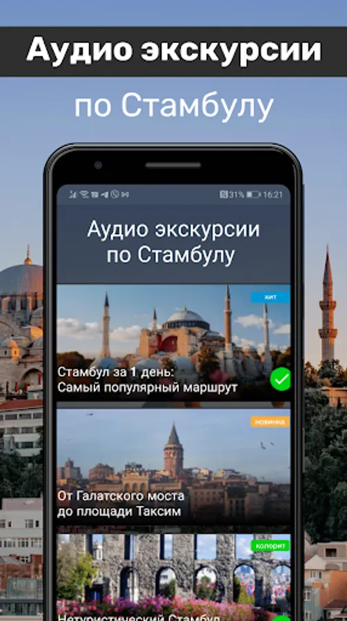 You will find 3 ready-made audio tours of the center of Istanbul, during which you will learn about its most important sights, preserved monuments of the Roman, Byzantine and Ottoman periods, main streets, districts and squares.
