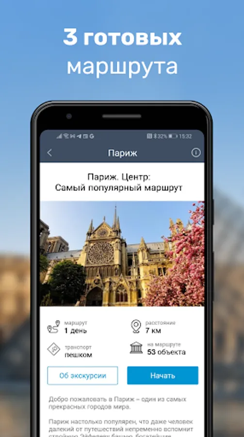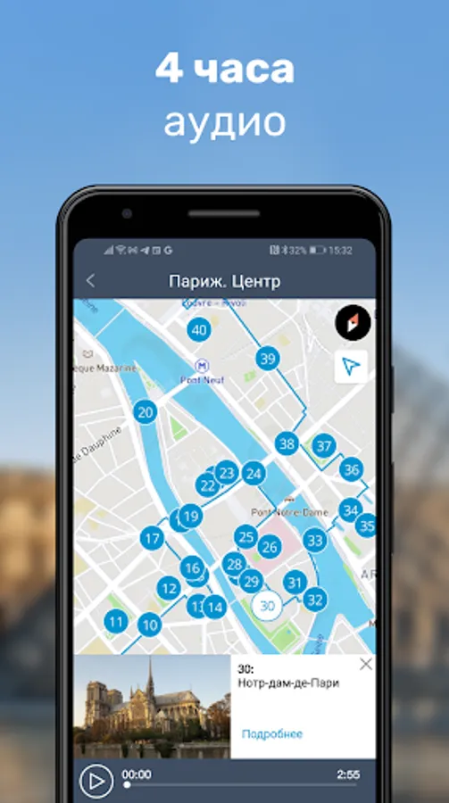 Paris: Travel Guide & Map app is three ready-made audio tours of the most popular tourist routes in the French capital, which will help you learn much more than 95% of travelers can do, and at the same time significantly save on guide services when visiting the city.