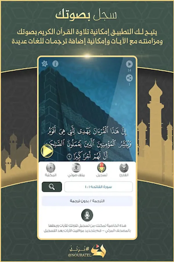 Spread the recitation of the Noble Qur’an with your voice now or with the voice of your favorite reader, extract it as a video file with great design, and share it with your friends ..