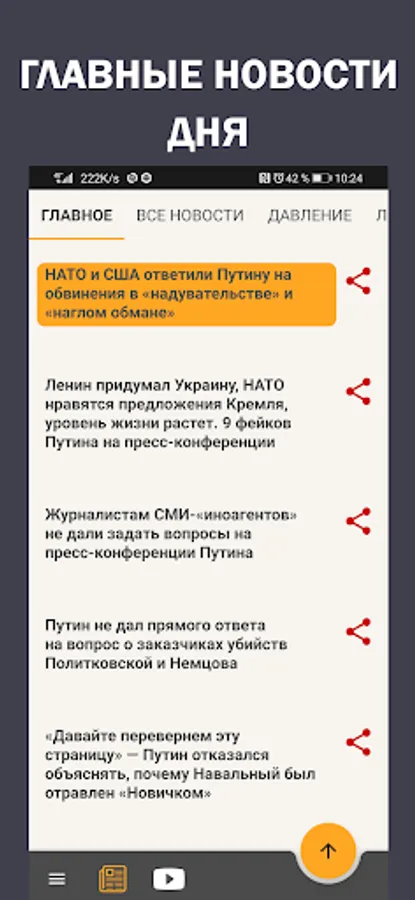 In one application all the main world news in Russian from independent media outlets dealing with real journalism. Read the latest news , scandals, investigations, exposing fakes. News of Russia, news of the world. Fresh news of science and technology, sensations, discoveries, forecasts of the future, news of sports, health and medicine. News of Moscow and regions. Politics and economics news. International relations, sanctions, a new cold war. An inconvenient truth that today is unlikely to be shown on TV, harsh assessments of state leaders and current policies, witty jokes, memes, anecdotes, ruthless humor about us and our lives. Hot news of protests, strikes, hunger strikes, incidents, crime. Urgent notifications about the hottest topic of the day - be the first to stay updated. Reliable sources, quality analytics from experts. News from the fields of international summits and meetings. What do Putin, Trump, Merkel and other world leaders want? What are the chances of the Russian opposition? What is Navalny planning? Search for those who benefit and where the money is. Where do oligarchs keep their finances and what real estate do they own? What is the currency rate to expect in the near future? Where will the oil price go? Is it time to buy cryptocurrencies, is it too late to mine bitcoin? What's the next blow to your wallet? Secrets of confrontation between the special services - FSB, FBI, CIA, NSA, MI5, MI6, MOSSAD. What wars are spies, soldiers and Russian special forces preparing for? What do they think about it abroad? Is the third world war threatening us? What does the future hold for the European Union, UN, CIS? Watch the video, find out the opinions of political video bloggers.