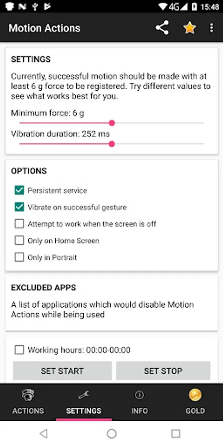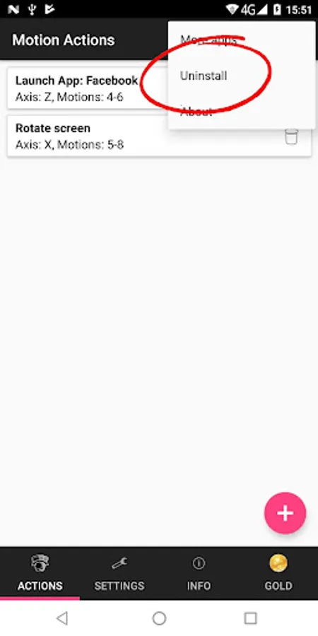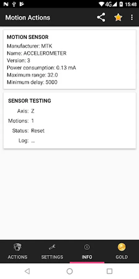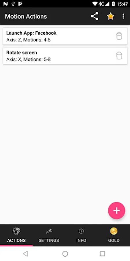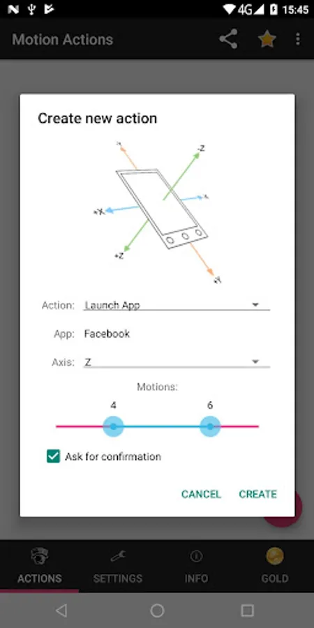 This is a small, innovative and useful utility, allowing you to perform various actions using the motion sensor of your device. You can set unlimited different actions depending on the exact number of motions in one of the three different axes (X, Y and Z).