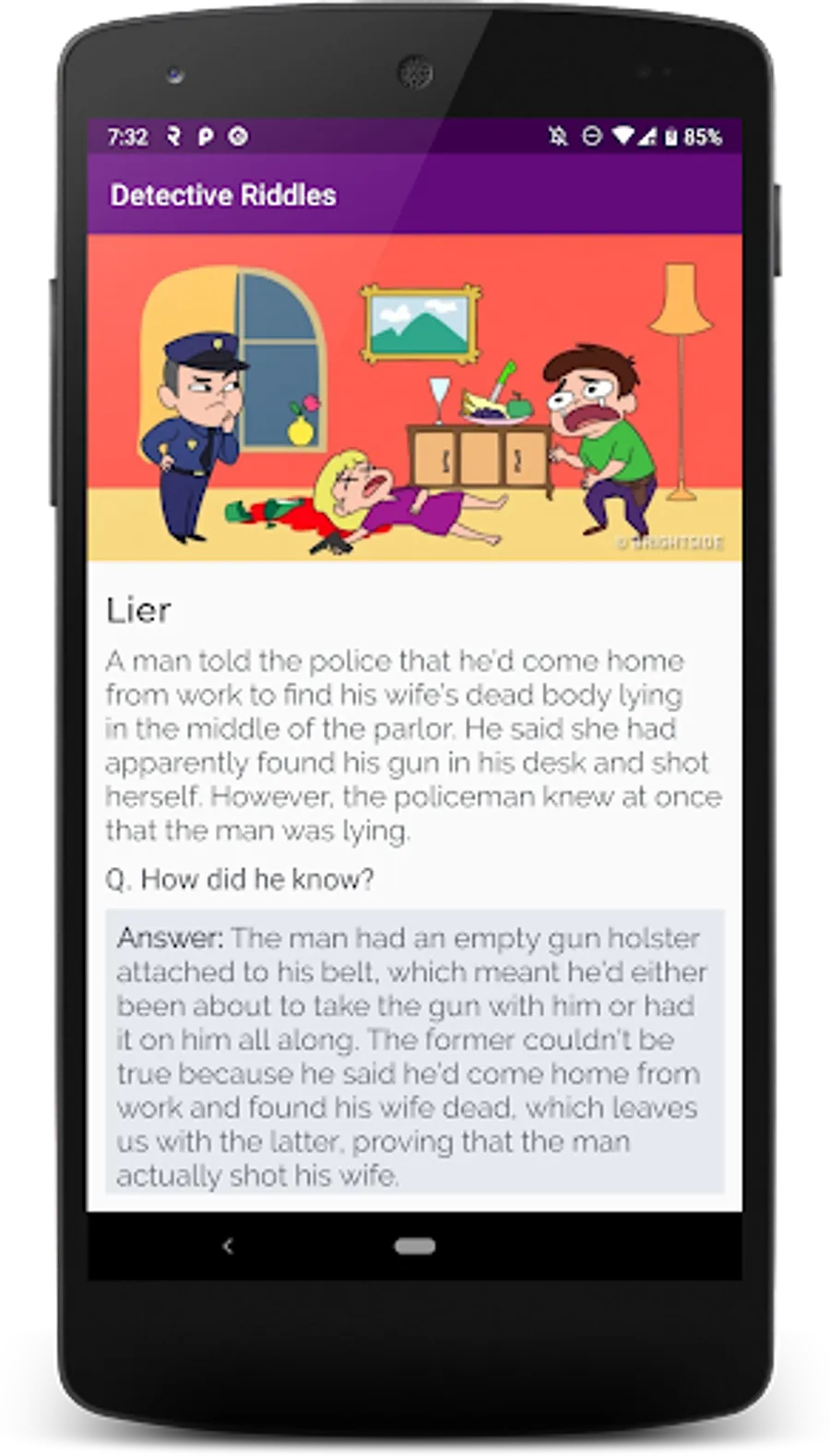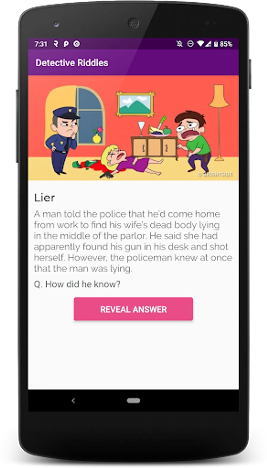 Disclaimer: All the contents included in "Detective Riddles" app are gathered from different online sources. We don't own copyright on all of the images and other riddle contents used inside our app. We only gather the riddles available in different online platforms and compile them in our app. If you think your content is used without your permission, please send us your request to remove content from our app. We will respond as soon as possible.