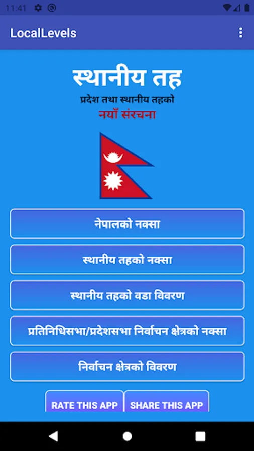 This app is not affiliated to any government entities and part of any government bodies. The contents available in this app are copyrights of their owners. Sources and copyrights are clearly available in the app. The app just includes the information about the number of local levels, their location, Name and picture map of local levels of Nepal which are freely available contents for the public. The source of administrative map is Department of Survey, Nepal and the source of others details are Ministry of Federal Affairs and General Administration of Nepal.