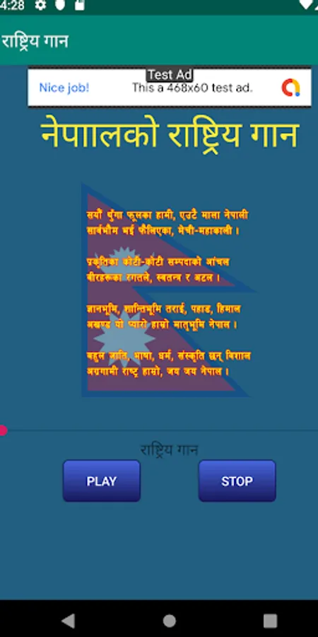 National Anthem of Nepal (नेपालको राष्ट्रिय गान) is an android mobile application. This app is developed for the users who like, love, play, listen and learn about National Anthem of Nepal. This app has following features