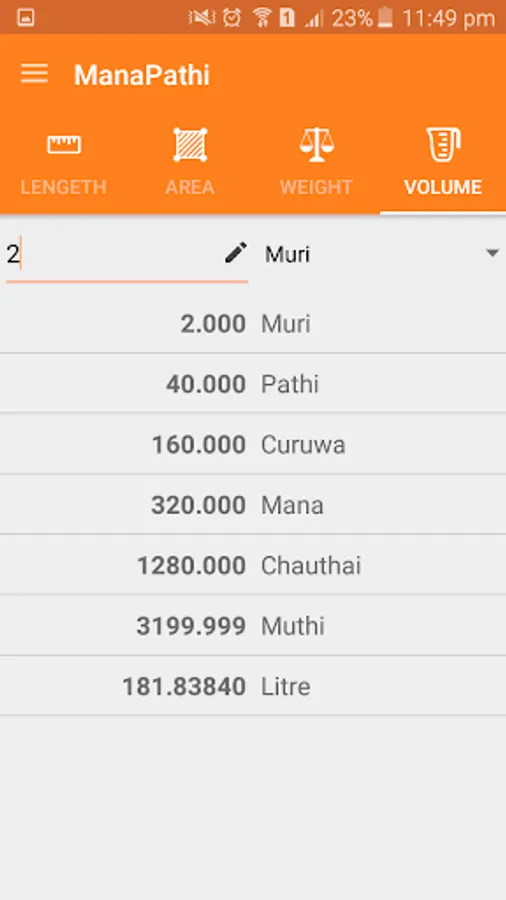 - Volume include: Muri, Pathi, Churuwa, Mana, Chauthai, Muthi & Litre