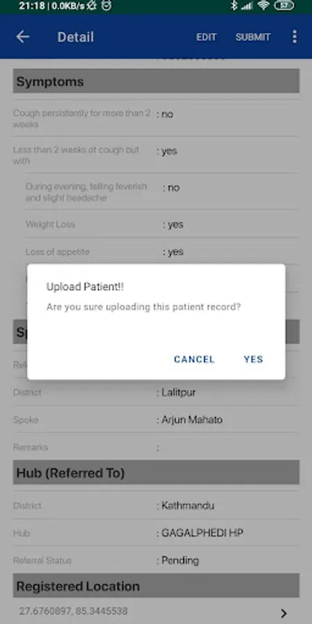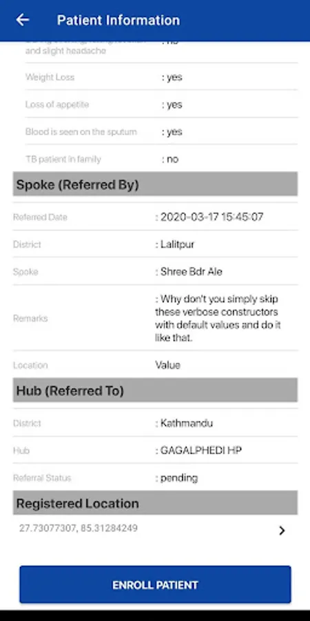 National Tuberculosis Control Center (NTCC) as part of it's National Tuberculosis Program (NTP) released this eTB PPM application which works based on popular Hub and Spoke mechanism to identify, track, diagnose and enroll Tuberculosis patients. In this application NTCC will register Hub & Spoke providing login credentials for them. Spokes may be Urban Volunteer or Pharmacy are responsible for identifying individuals with symptoms of TB and enter details about them in Registration interface. Spoke choose a nearby Hub for the patient to be tested for TB. When Hub login the application s/he can get the list of patients referred to them (by Spoke) for diagnosis. If a patient visit the Hub, then Hub enter diagnosis result and findings of patient. If the patient is found to be TB +ve they will be referred to treatment center (DOTS or Non-DOTS) center, if not then simply the diagnosis detail are submitted to server. The application need internet connectivity during Login and offline recorded data submission step. Once logged in all necessary data will be fetched from server and will check for new records if internet connectivity is available. After referring the patient to DOTS or Non-DOTS center, the patient enters on eTB ecoSystem where already developed systems eTB Master Register (for DOTS) and eTB Private Practitioner (for Non-DOTS) take care further endeavor of treatment regimen.