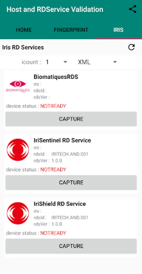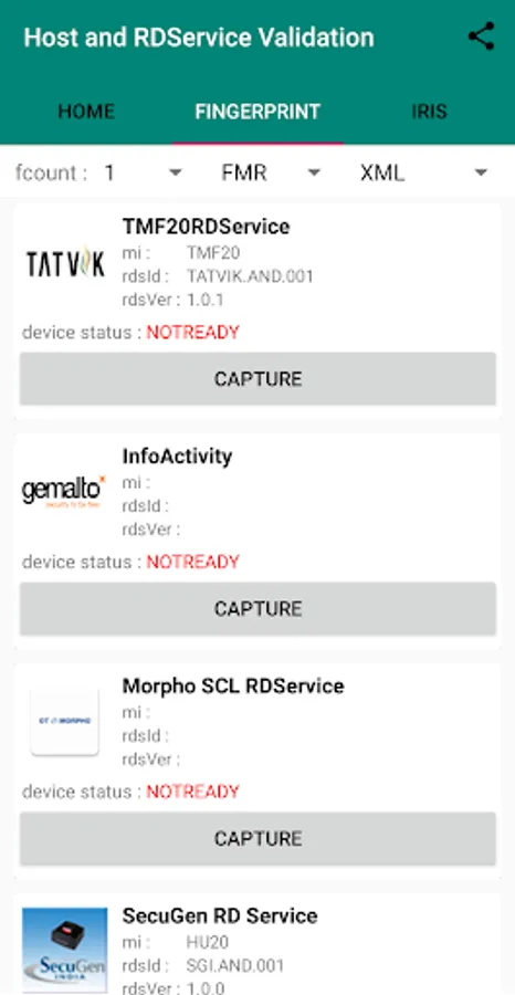 This app also has feature to test RD service of different modality (Fingerprint/IRIS) from different device vendors.