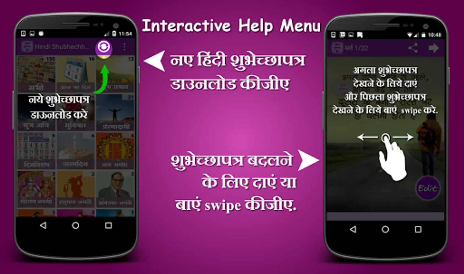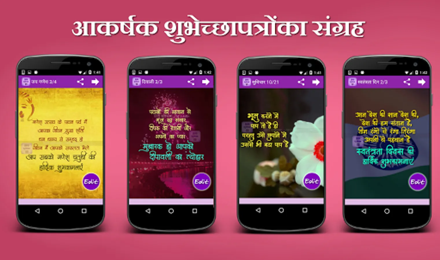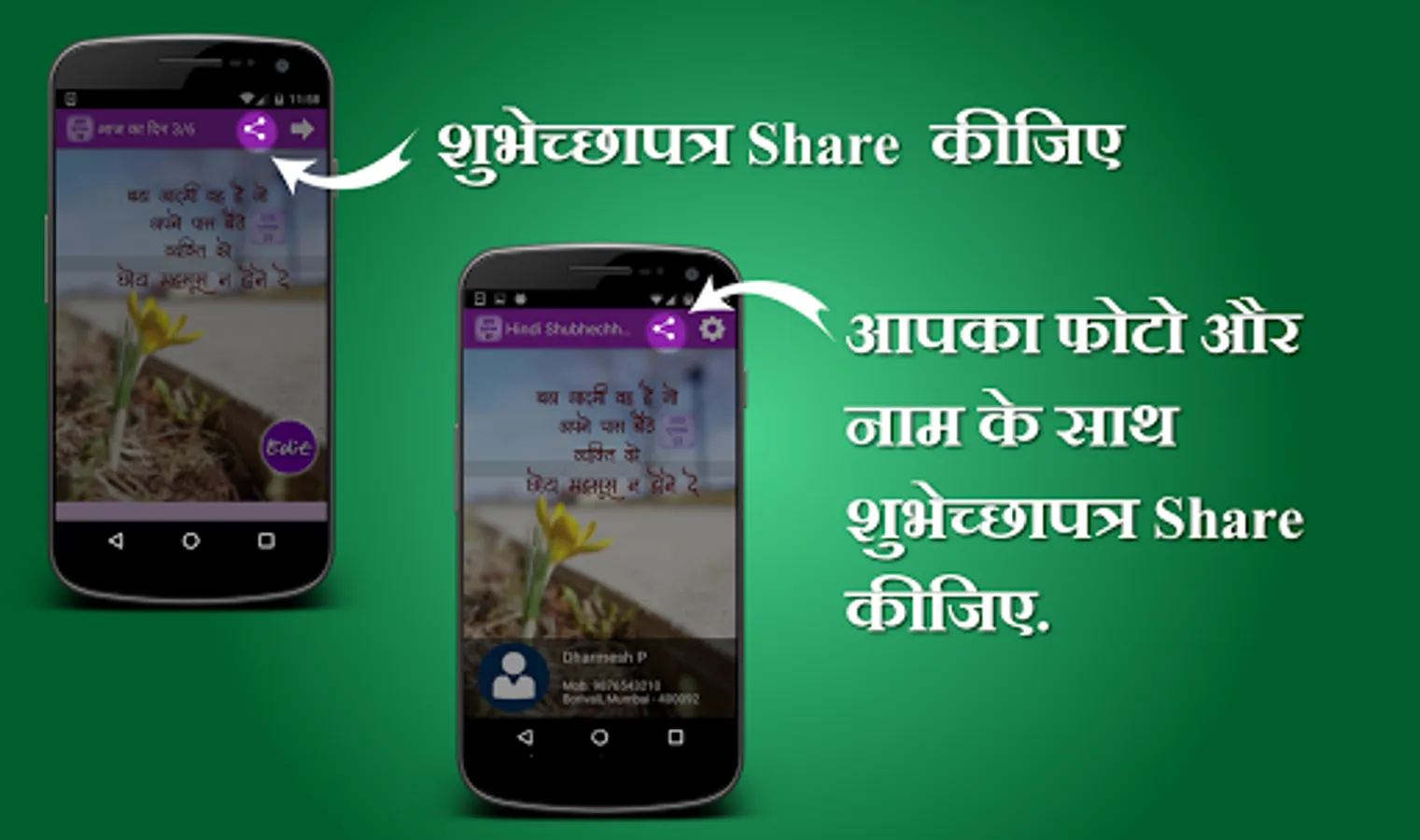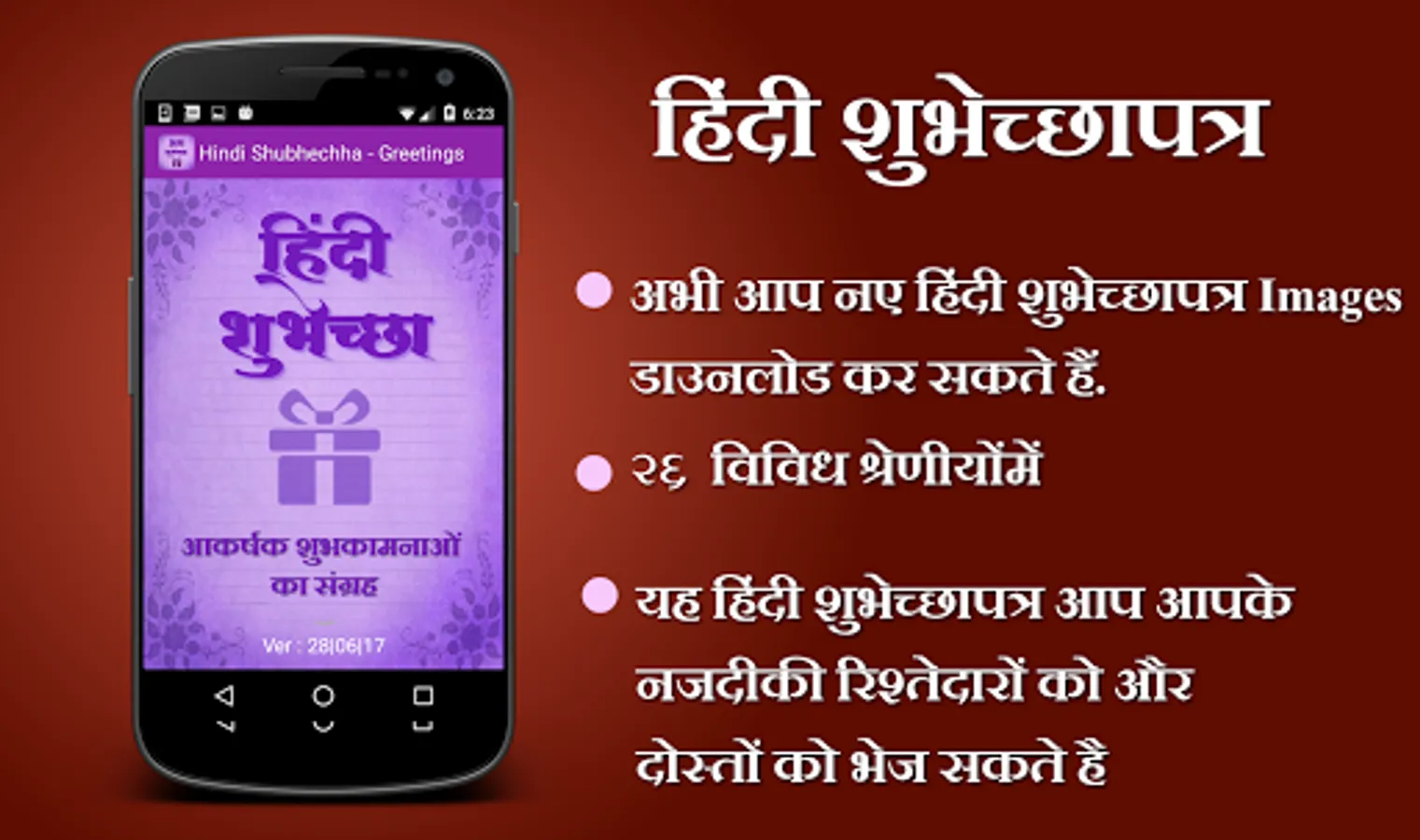 This app Contains Hindi Shubhechha Greetings Images for your loved ones. Using this app you can send greetings of various occasions and best wishes to your loved ones, friends, relatives and colleagues in Hindi language. Now send Hindi greetings with your name, photo and description.