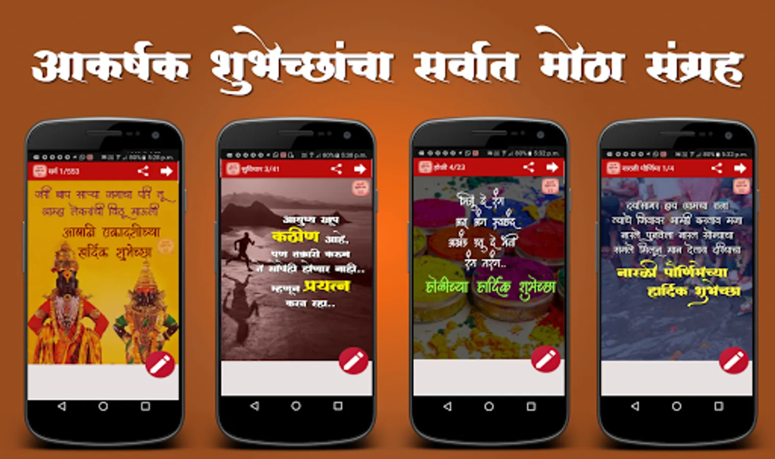 This app Contains Marathi Shubhechha Greetings Images for your loved ones. Using this app you can send greetings of various occasions and best wishes to your loved ones, friends and colleagues in Marathi language. Now send Marathi greetings with your name, photo and description.