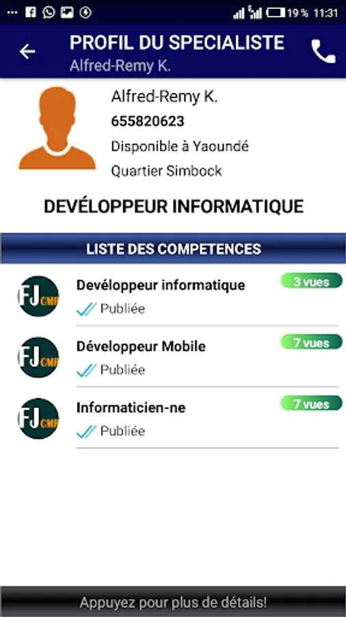 FaceJob-Cameroon is an application that allows you to recruit a specialist near you, without moving around and in several fields of competence.