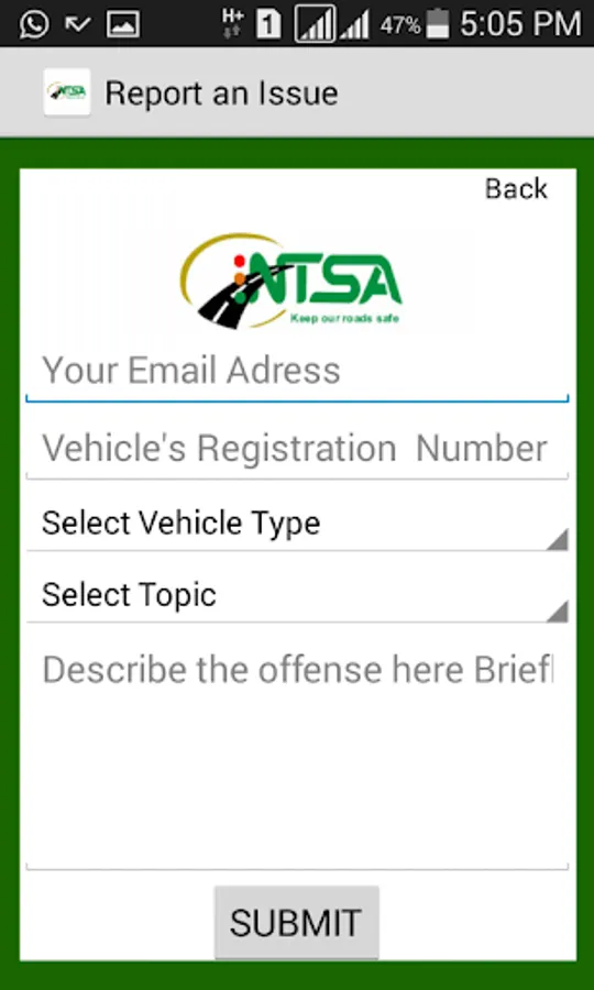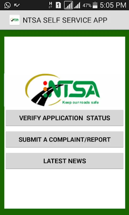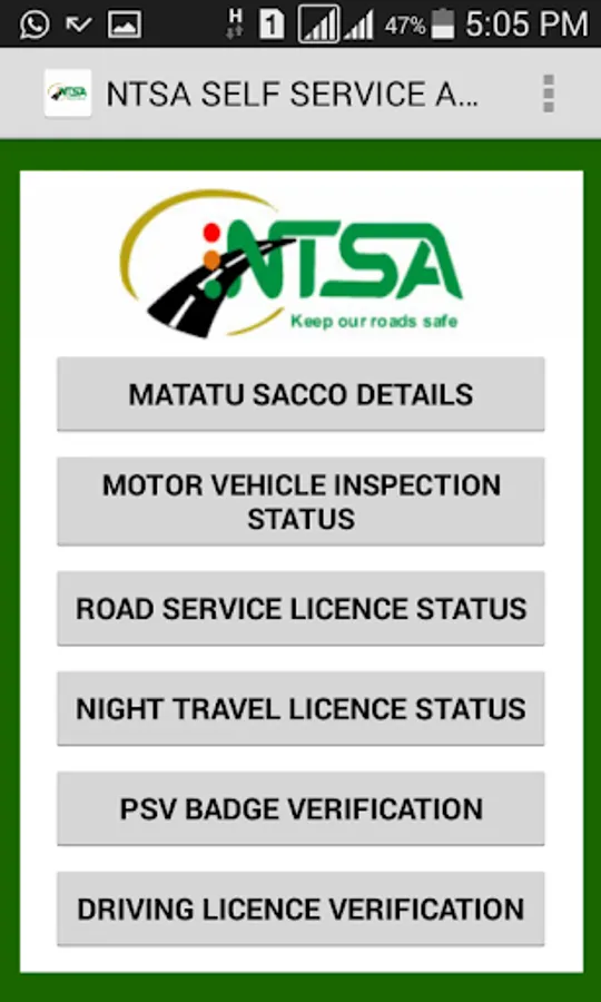 Welcome to the NTSA SELF-SERVICE APP. Using the app, you can now be able to perform all the enquiries regarding the validity of various compliances status in the transport sector.