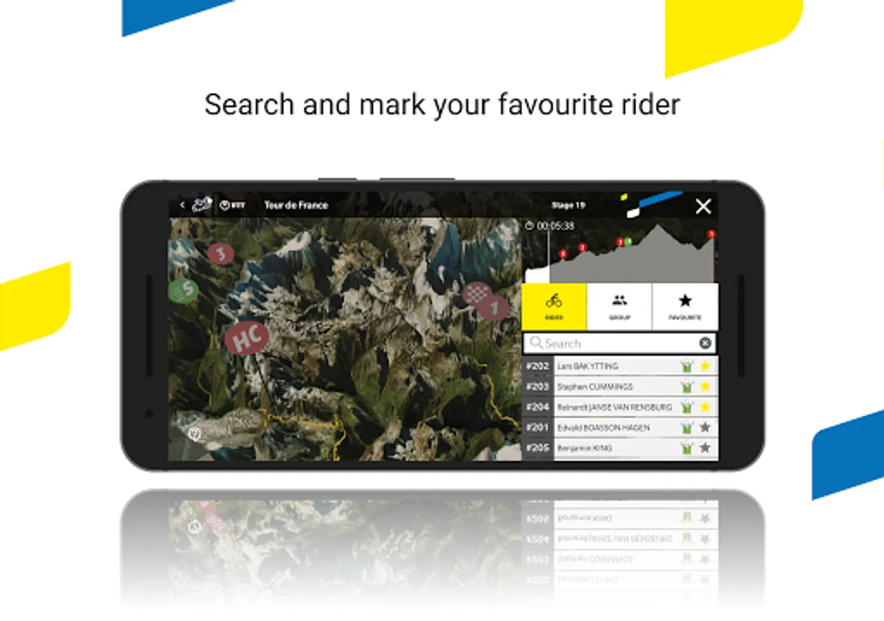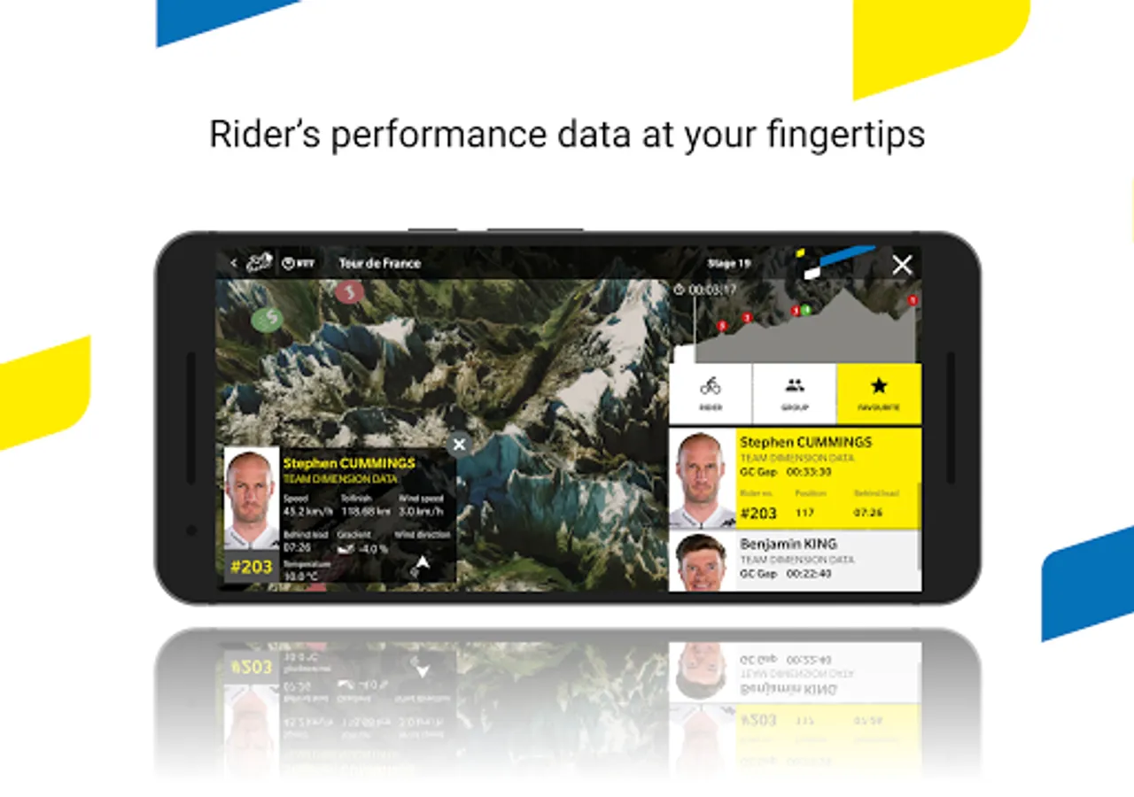 Pick your favourite riders and see their progress on the stage, or combine them with the group view. The experience synchronises in real time with the official Tour de France website and mobile application.