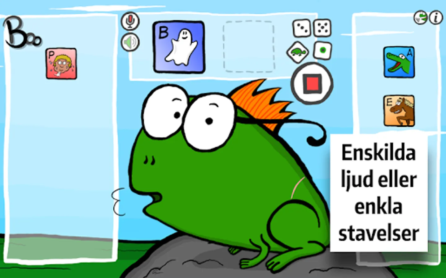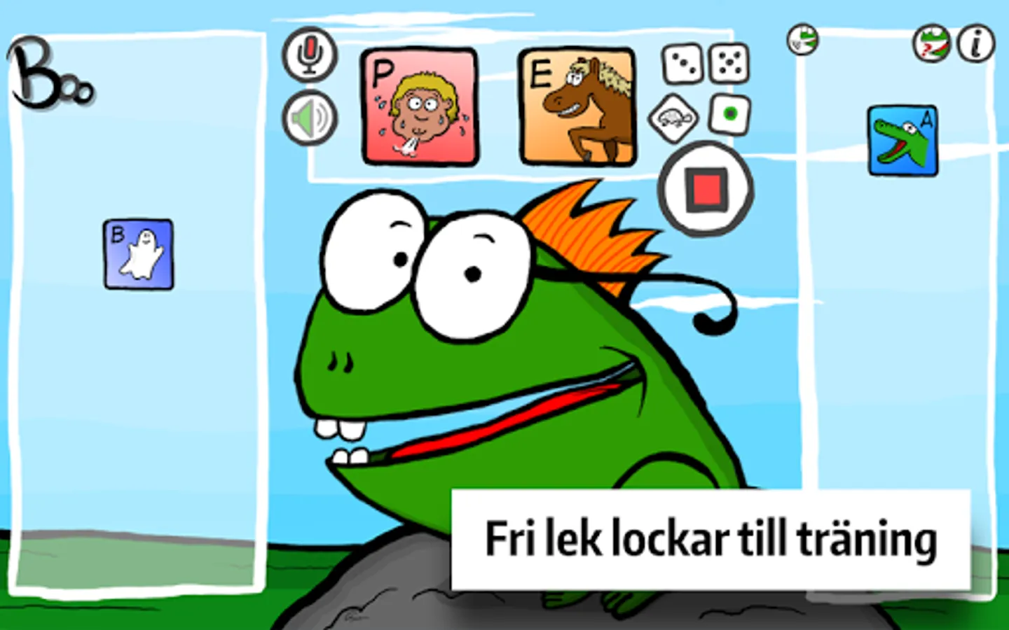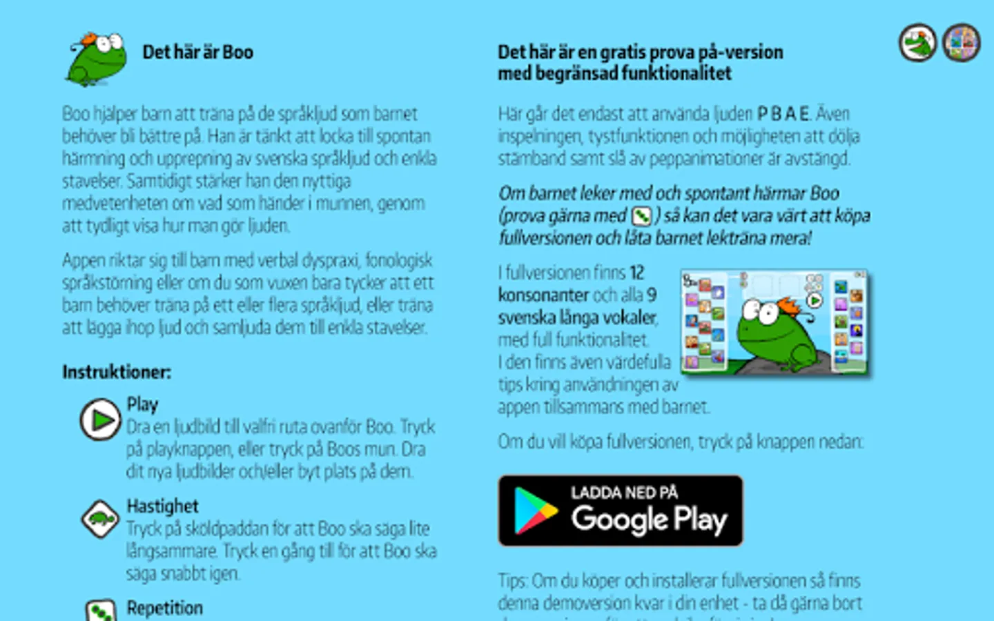 If the child spontaneously imitates Boo and needs to practice more sounds and syllables, then there is the full version with the consonants P B T D K G S F V M N L R, all Swedish vocals and more features , including helpful tips from the speech therapist.