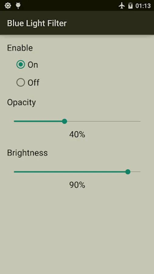 - Easy to use. just enable then set percent of brightness level (0-100%) and set percent of blue light filter
