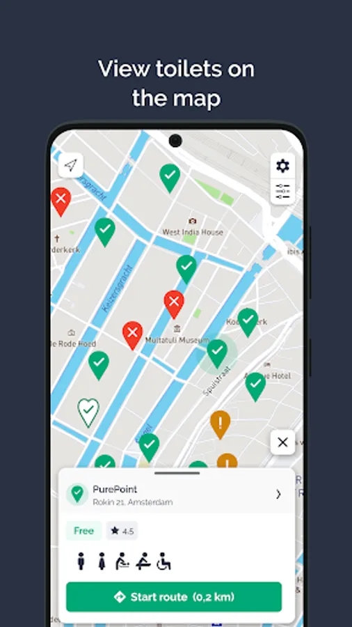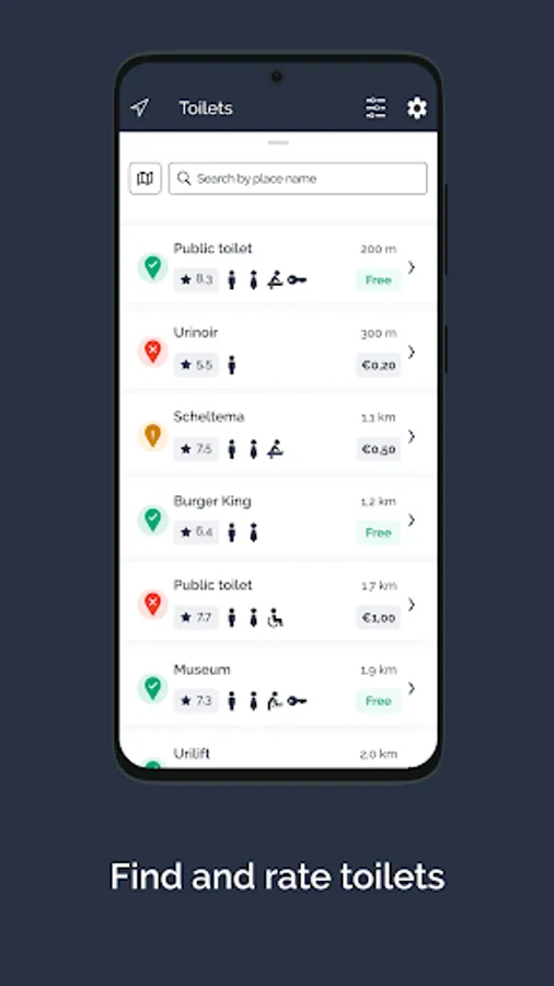 • Distance to the toilet – presented in a list or on a map.