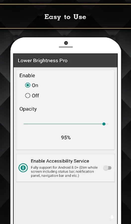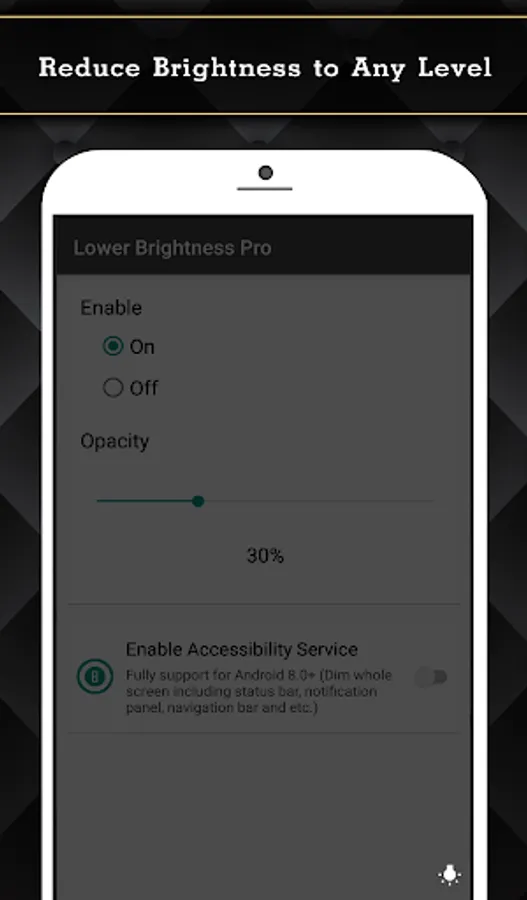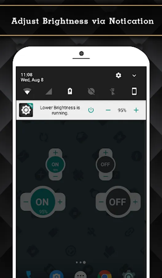 - Fully support for Android 8.0+ (Dim whole screen including status bar, notification panel, navigation bar and etc.)