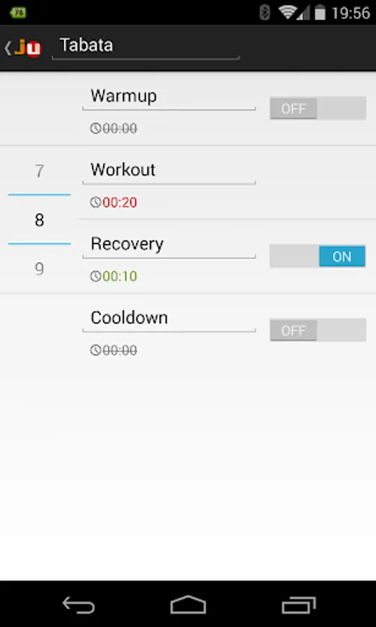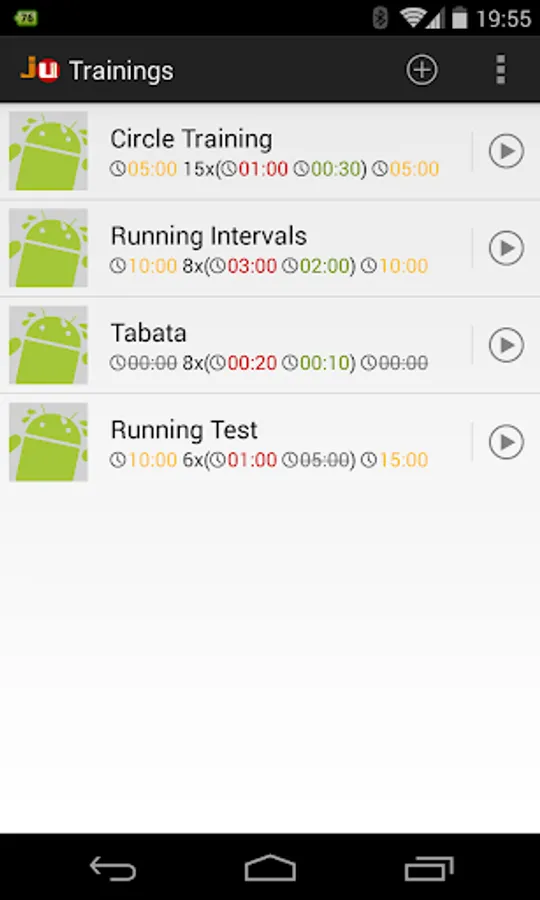 With ju Interval Trainer you can choose your favorite pushing music for the workout and quiet music for warm-up, recovery and cool down. The application takes care of changing the music according to your traning phases.